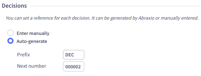 Automatic reference generation at decision creation is enabled by default on all environments. You can: