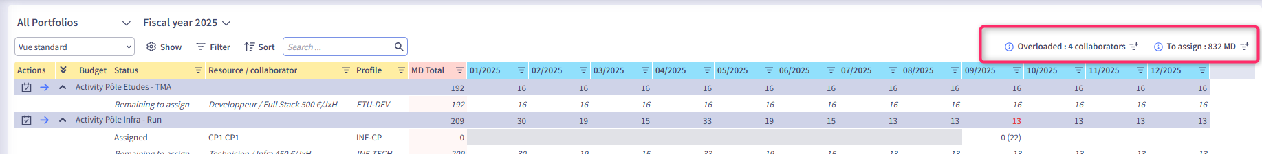 - Remaining to be assigned: Indicates to you, in light of the staffing needs expressed on the projects/activities, the number of JxH remaining to be assigned to employees over the selected time range. By clicking, you then filter on all the lines remaining to be assigned.