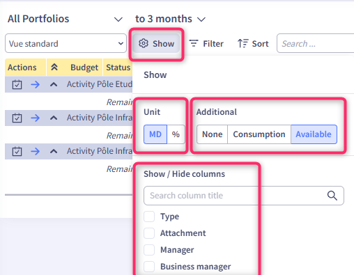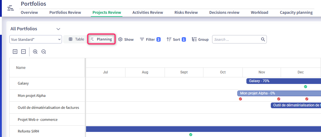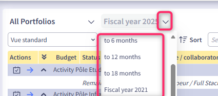 This view is composed of a filter bar that allows you to select a set of coherent projects or activities ("All projects currently being implemented", "All projects in qualification", "All projects that impact year N in terms of planning or budget", etc.).