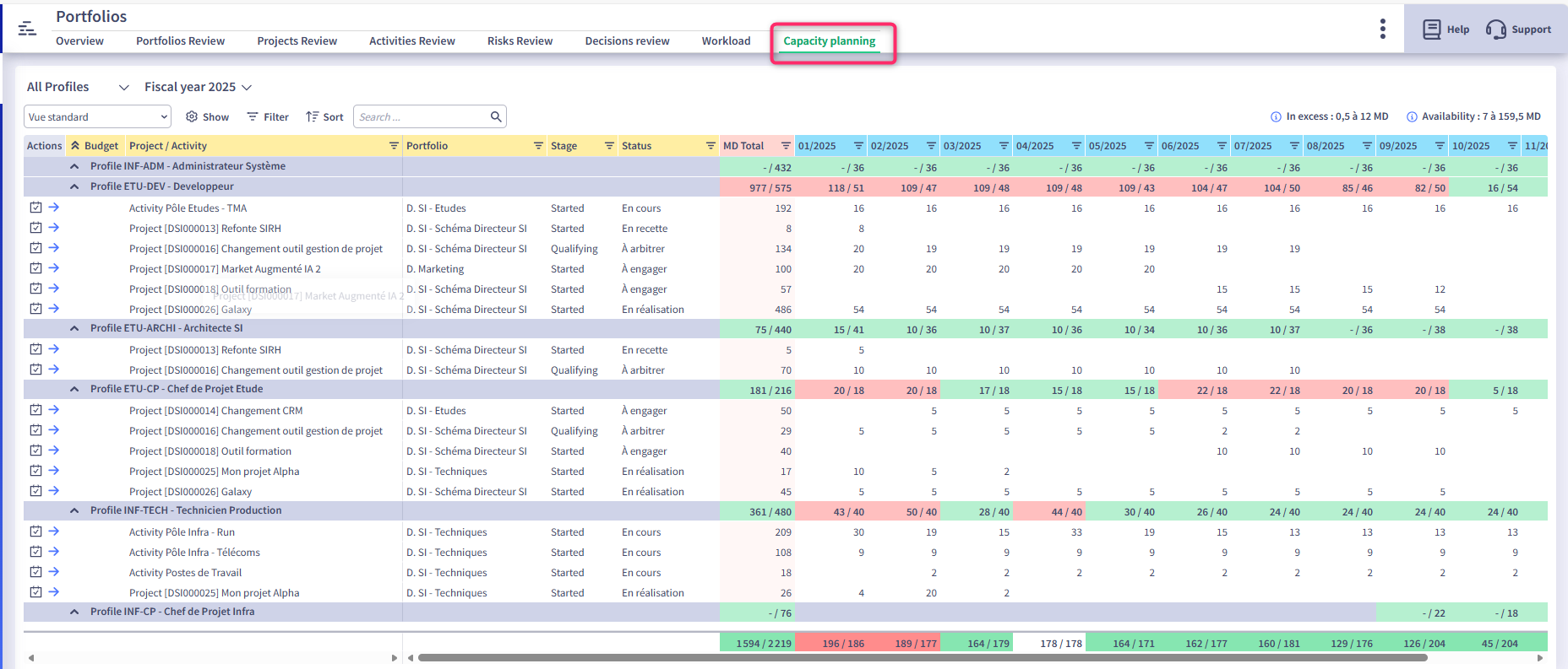 - Availability: for months when your employees' capacity exceeds needs, you can view the extent of availability and therefore the level of understaffing at a macro level.