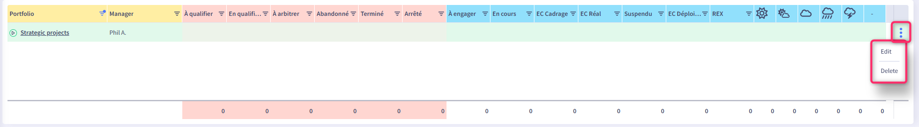 Editing characteristics is accessible from the global view of projects, in the advanced menu to the right of the portfolio line:
