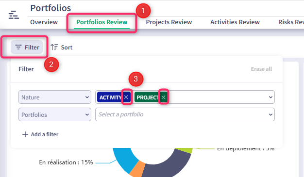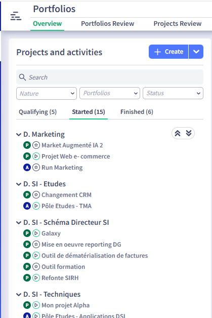 - You can filter by Nature (Activity and/or Project) or by portfolio to refine your view. As a reminder, the scope viewed depends on your authorizations.