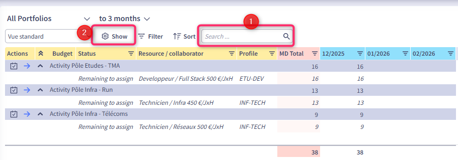 - Non/Consimption/Available : allows you to display in addition to the assigned/remaining JxH, the consumed or the availability of the collaborators.