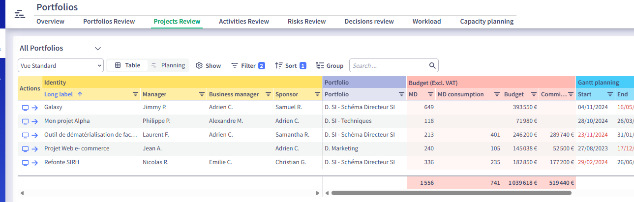 - In the table, by clicking on a row, you access the detailed view of the portfolio in the Projects or Activities tab depending on its content. If your portfolio contains activities and projects, you will arrive in the Project Review tab.