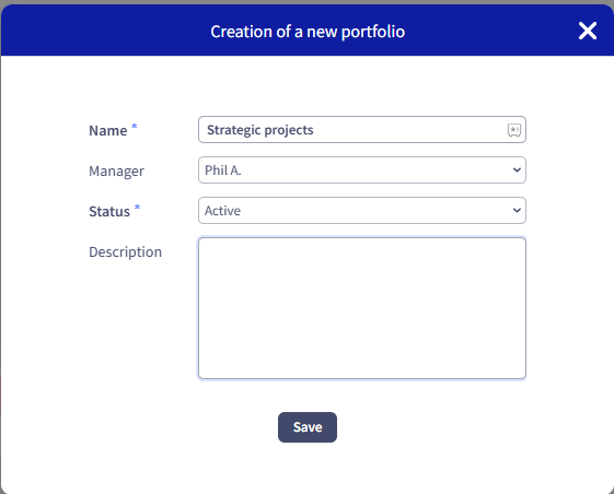 - Inactive : is no longer offered when creating/editing a project/activity but can still exist on an old project. Note that in the global view of portfolios, you will find all active portfolios + all inactive portfolios that still have unarchived projects.