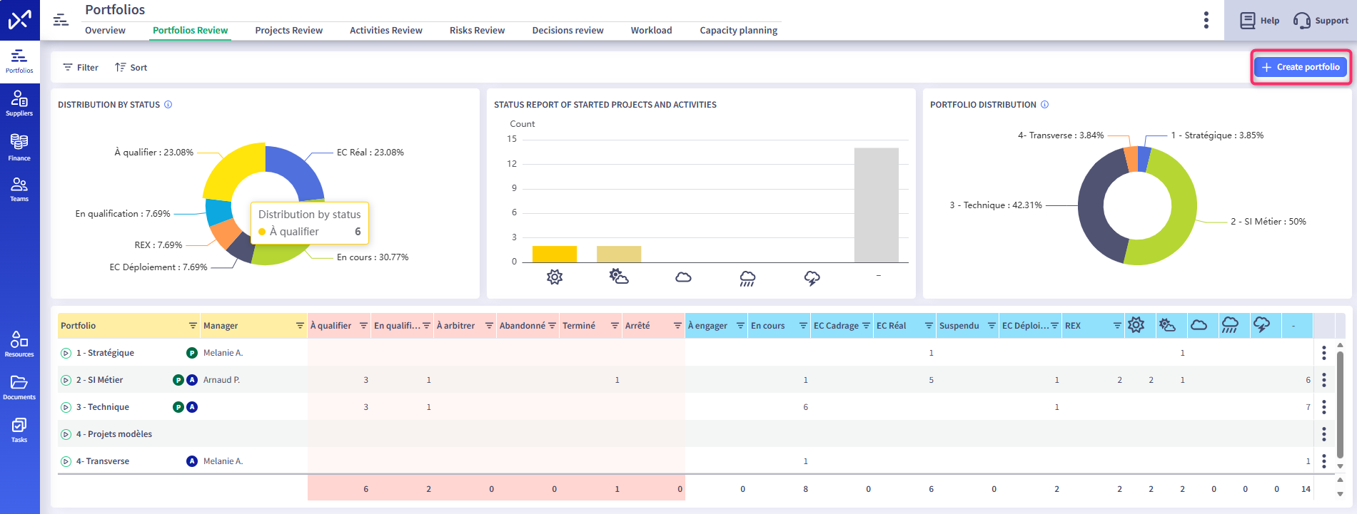 From the dashboard , Portfolios tab, you access the overview of your portfolios with the presentation of clickable KPIs and the summary by portfolio of non-archived projects/activities.
