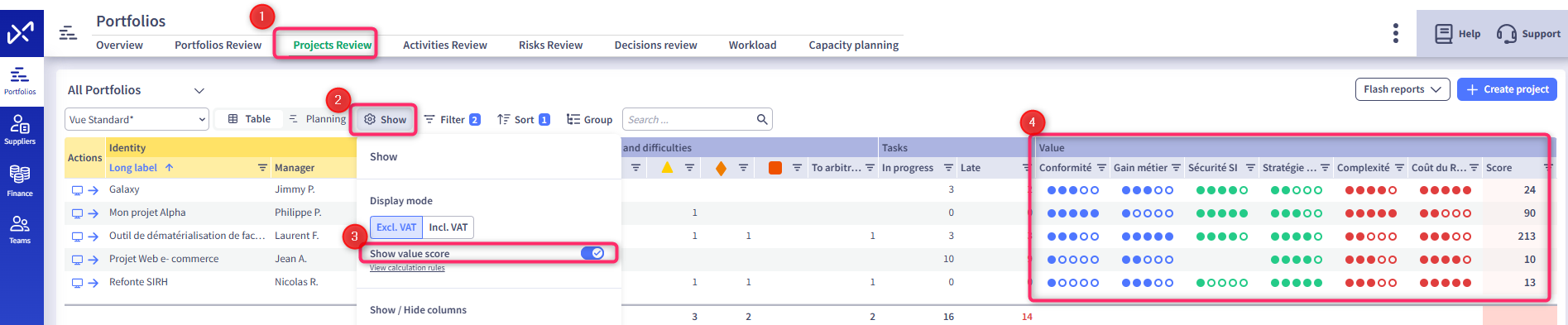 In the Projects Review, for example, you can filter your projects to arbitrate and activate the Display score toggle on the right of the table: