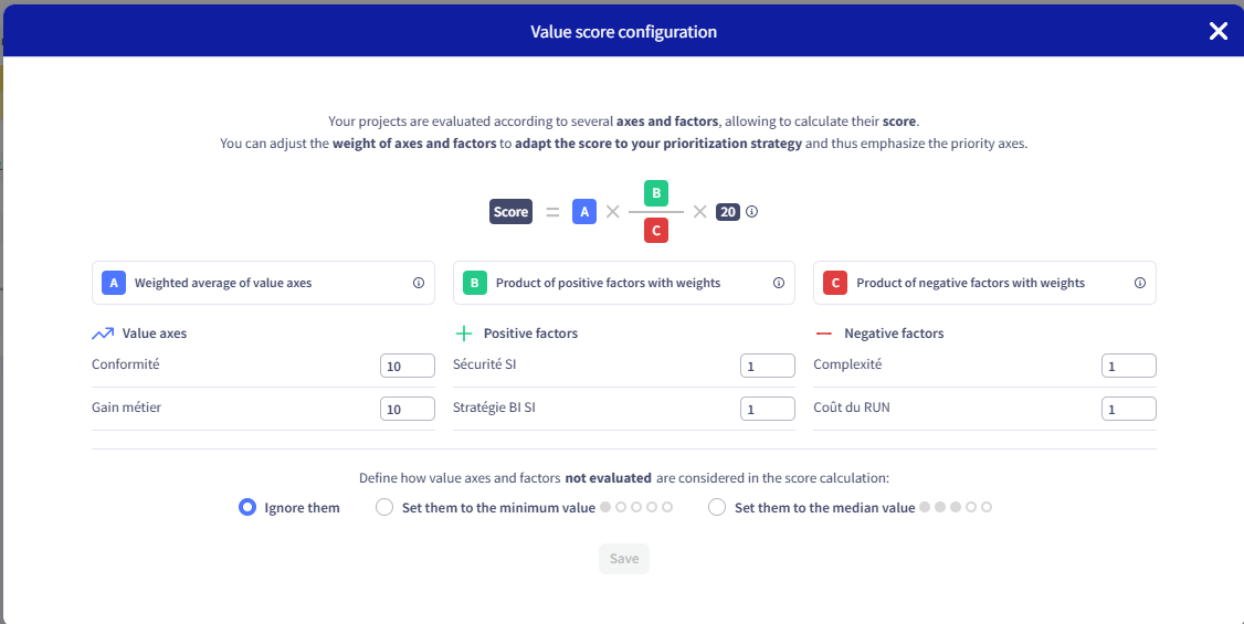 A score is a numerical transposition of the project value assessment. It is contextual and linked to your Arbitration strategy.