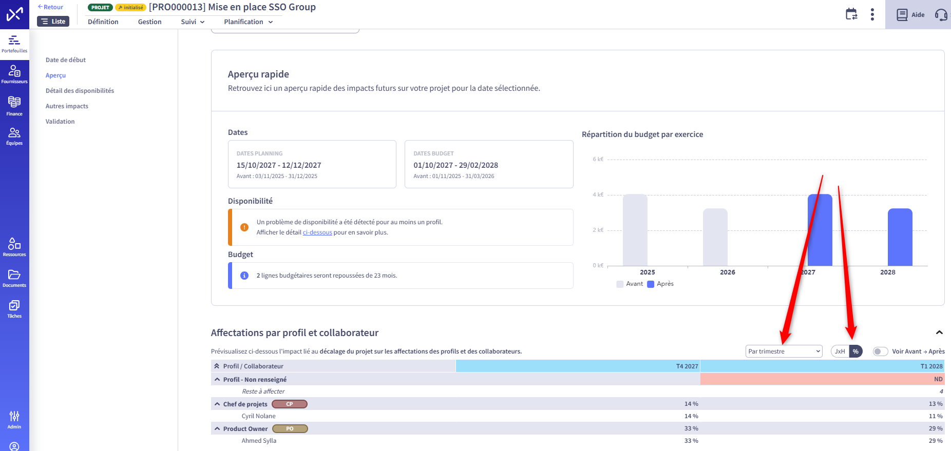 Added a percentage display to represent the allocation rate, as well as a grouping by quarter, allowing for quick identification of over-allocated projects.