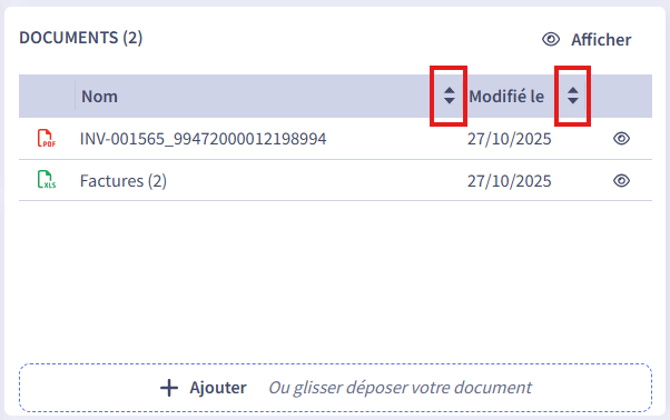 Added sorting by modification date or creation date, symbolized by chevrons in the supplier documents table