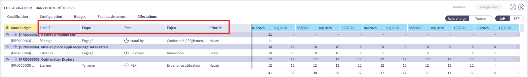 On a budget line of allocations, if an employee has entered consumed time without being assigned by name (time entry in “All” or “Team” on the line), the alignment from the consumed time generates a new budget line for the employee.