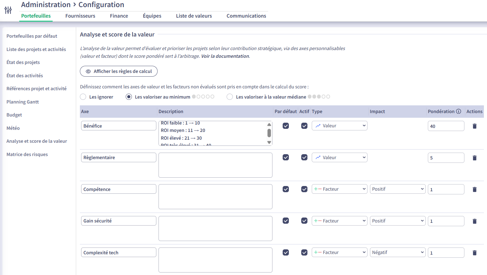 Scoring parameters are available in: Administration > Configuration > Portfolios > Value Analysis and Scoring