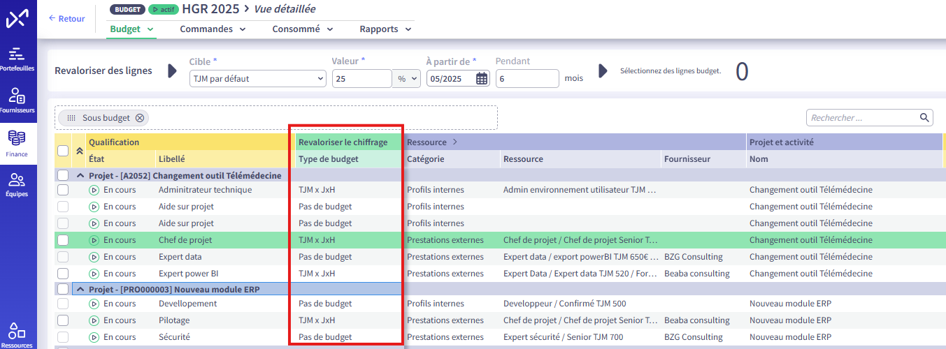 When you perform a mass revaluation of your budget lines as percentages, a new column " Revalue the estimate " appears.