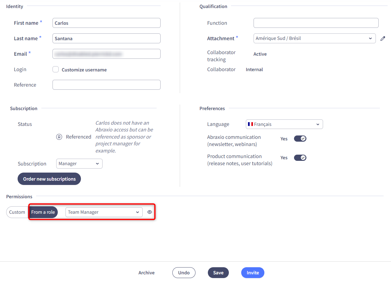 3- Minimum subscription required: the selected Abraxio subscription will predefine the modules / Scope / Options available depending on the chosen subscription ( Manager, Project Manager, Direction and Collaborator)