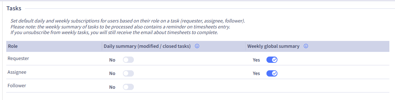 In this section, you can define the default daily and weekly subscriptions for users according to their role in a task (requester, manager, observer):
