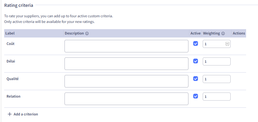 - Add a criterion: it is possible to add 4 custom criteria to a supplier evaluation in addition to the default criteria (cost, delivery time, quality, and relationship).