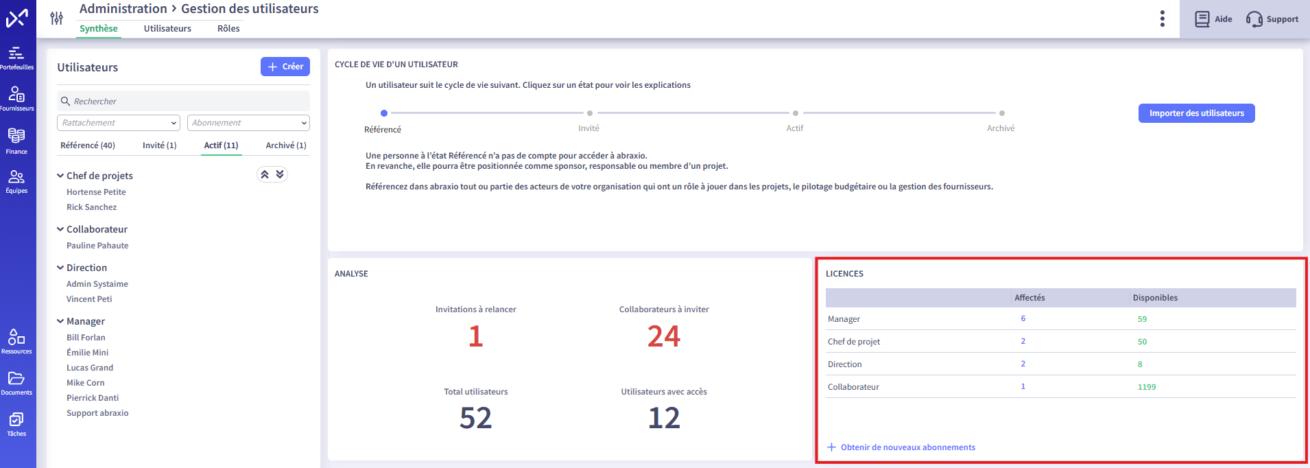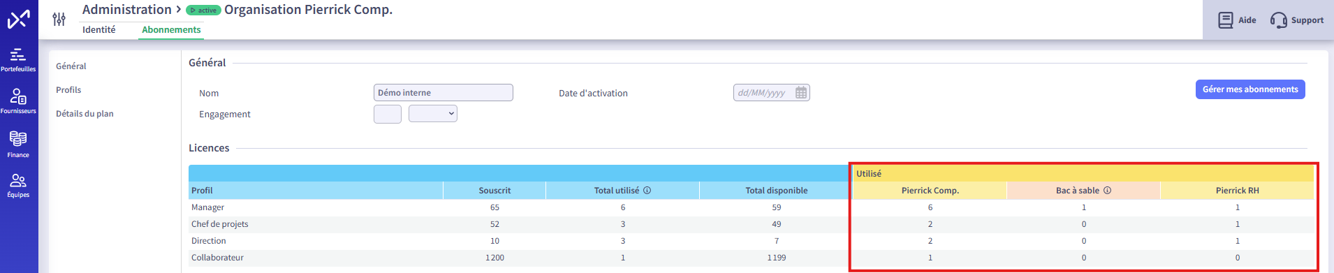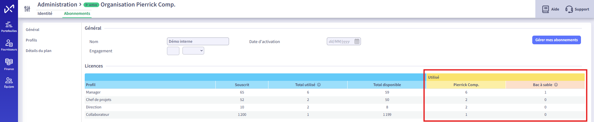 Je peux consulter cela depuis le module "Admin" → "Organisation" → "Abonnements".