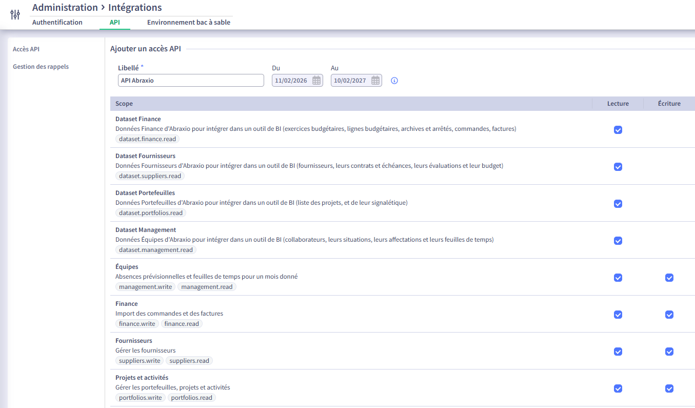 Un accès API a une durée de validité limitée à 12 mois. Au terme, il faudra générer un nouvel accès et l'utiliser dans vos appels API.