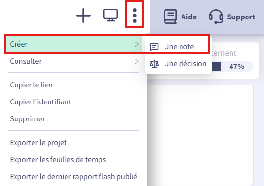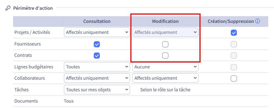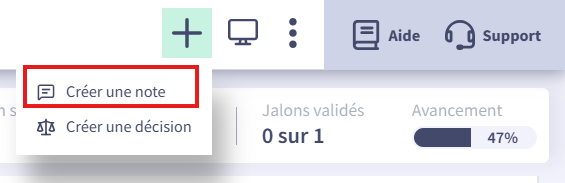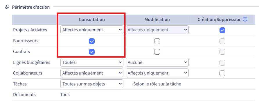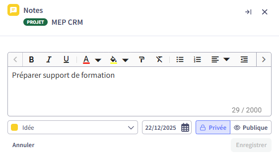 Pour créer une note, l’utilisateur doit disposer des droits de modification sur l’objet parent (Projets / Activités, Fournisseurs, Contrats).