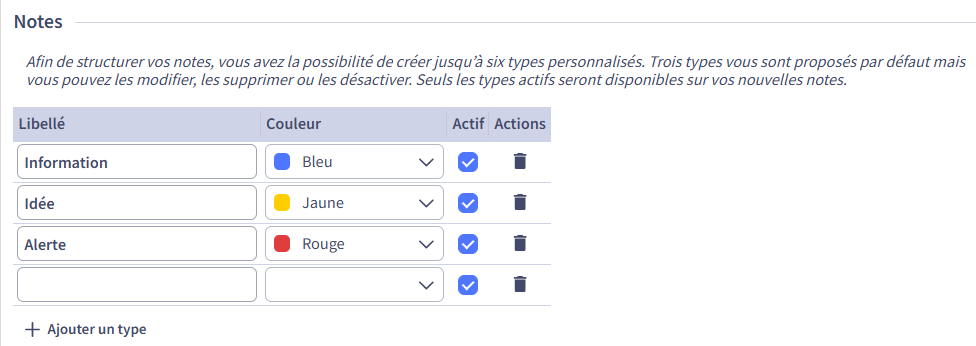 Un type peut être désactivé, auquel cas il n’est plus sélectionnable lors de la création d’une note.
