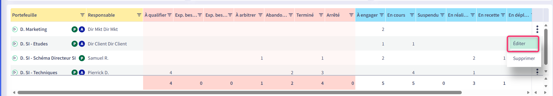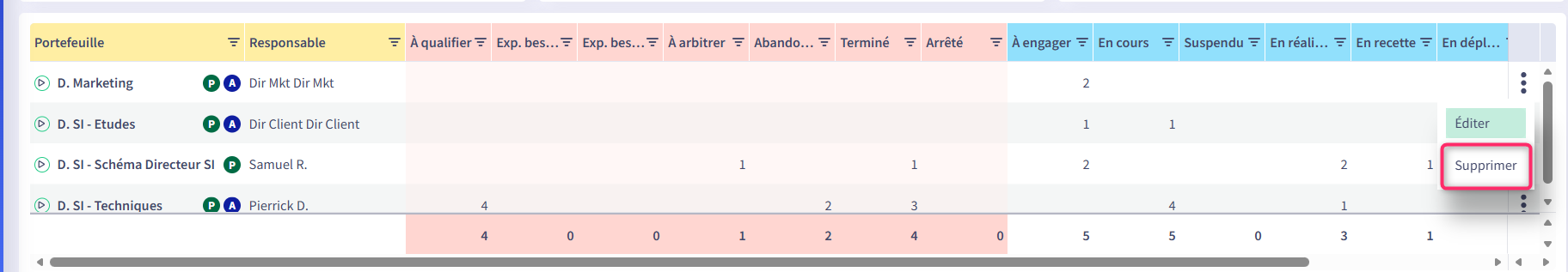 La suppression d'un portefeuille est accessible depuis la vue globale des projets, dans le menu avancé à droite de la ligne du portefeuille :