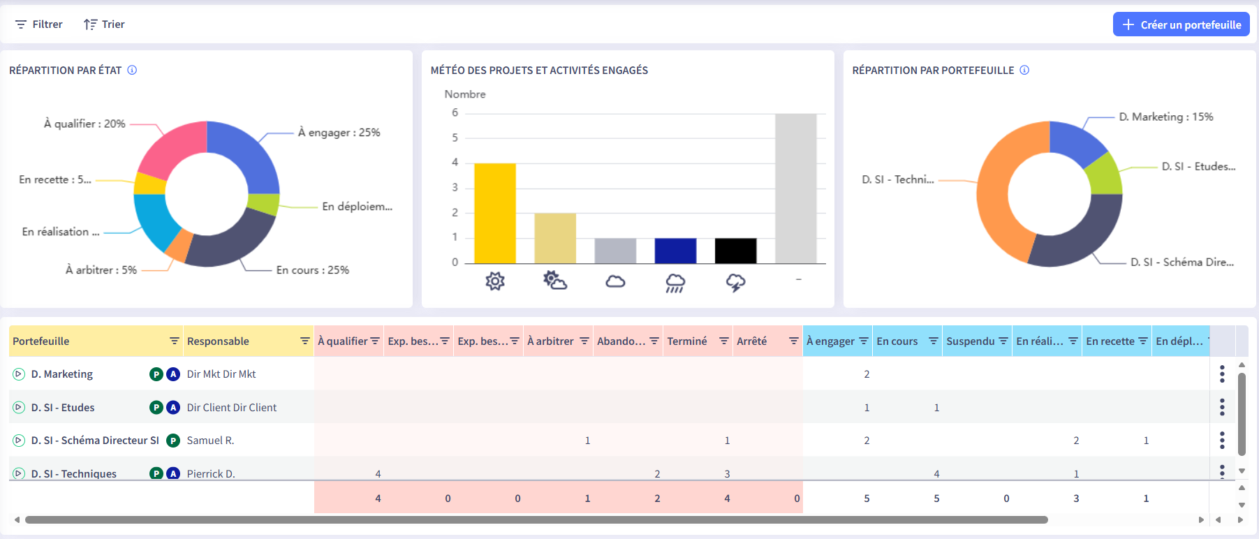 Depuis le tableau de bord, onglet Portefeuilles, vous accédez à la vue d'ensemble de vos portefeuilles avec la présentation de KPI cliquables et de la synthèse par portefeuille des projets/activités non archivés.