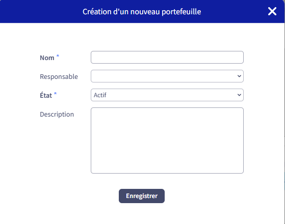 - Etat : actif (par défaut). Pour plus de détail, consultez la rubrique "Cycle de vie des portefeuilles"