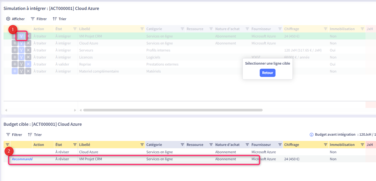 Le tableau du haut vous propose les lignes budgétaires du sous-budget de simulation que vous souhaitez intégrer.