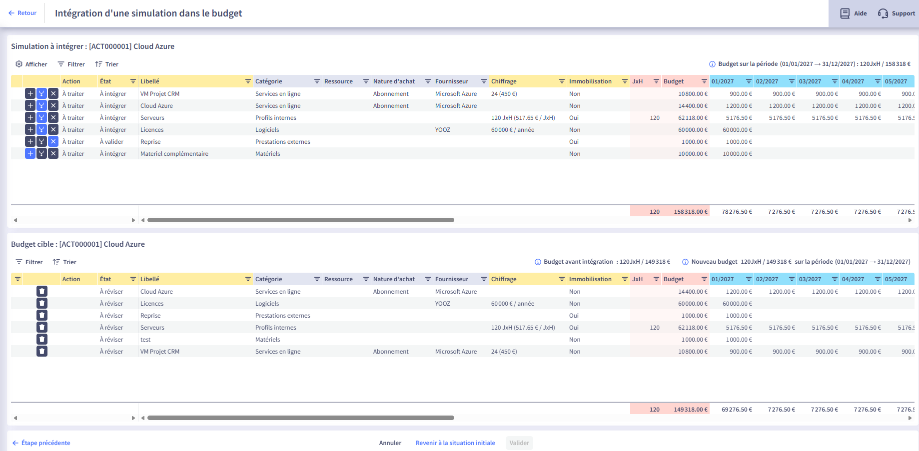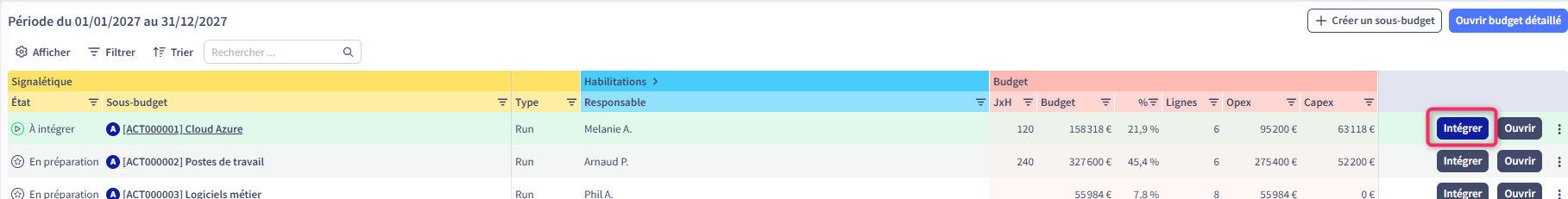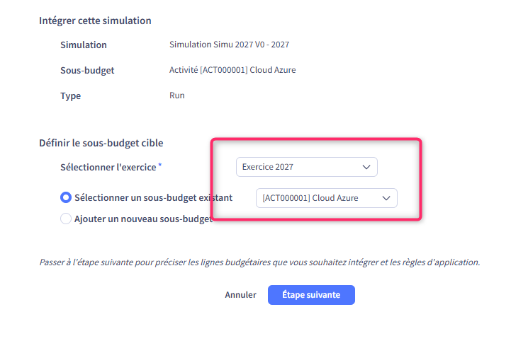 Le process d’intégration débute avec la sélection du sous-budget cible dans la vue Globale de la Simulation.
