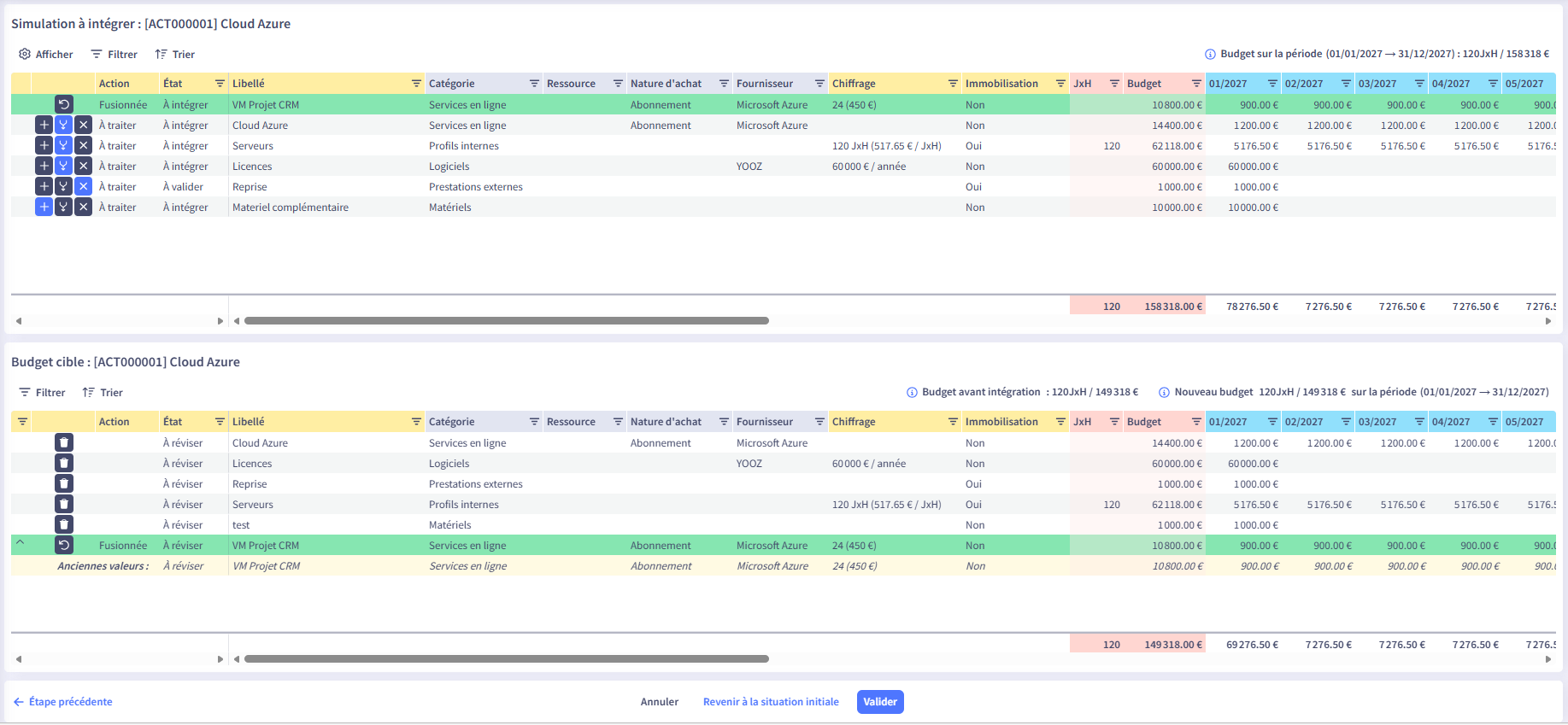 Réaliser une action d’ajout ou de fusion a un impact immédiat sur le tableau du budget cible.