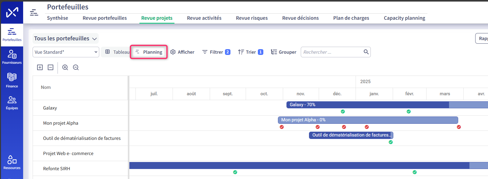 Depuis la revue de projets en mode Tableau, vous pouvez passer en 1 clic du mode tableau au mode Planning Gantt tout en conservant votre sélection de projets :