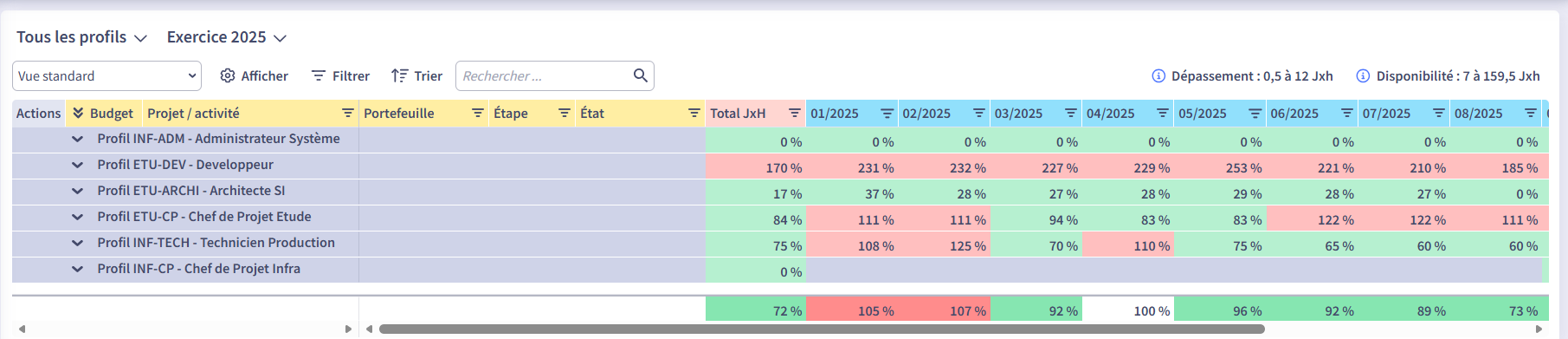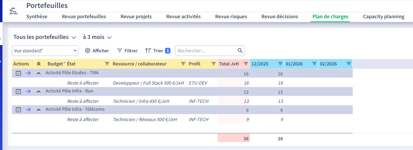 - Capacity Planning : cette vue présente les besoins d'affectations de chaque projet/activité par profil vs capacité à répondre à ces besoins. Elle nécessite des droits particuliers pour y accéder (accès complet aux projets/activités et à leurs budget)