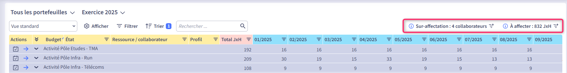 Vous pouvez appliquer des filtres pour analyser plus précisément un périmètre : un portefeuille, les projets en cours, les affectations sur les 3 prochains mois, etc.