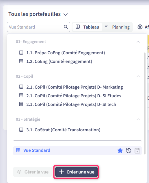 - Revue projets : vue en mode Tableau ou en mode Planning de vos projets accessibles