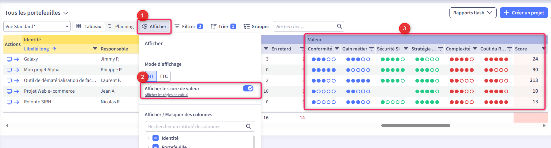 Cette vue est composée d'une barre de filtres qui vous permet de sélectionner un ensemble de projets ou activités cohérents ("Tous les projets en cours de mise en œuvre", "Tous les projets en qualification", "Tous les projets qui impactent l'année N en termes de planning ou budget", etc.).