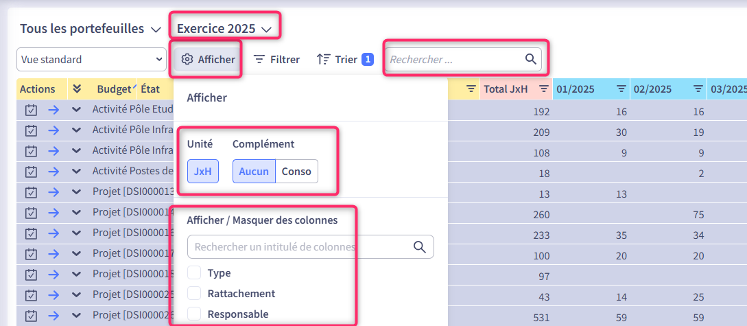 - Vous pouvez filtrer par Nature (Activité et/ou Projet) ou par portefeuille pour affiner votre vue. Pour rappel, le scope visualisé dépend de vos habilitations.
