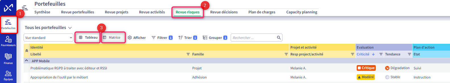 - Revue portefeuilles : cet onglet permet de gérer les portefeuilles (voir article Gestion des portefeuilles et d'accéder aux indicateurs par Portefeuille.