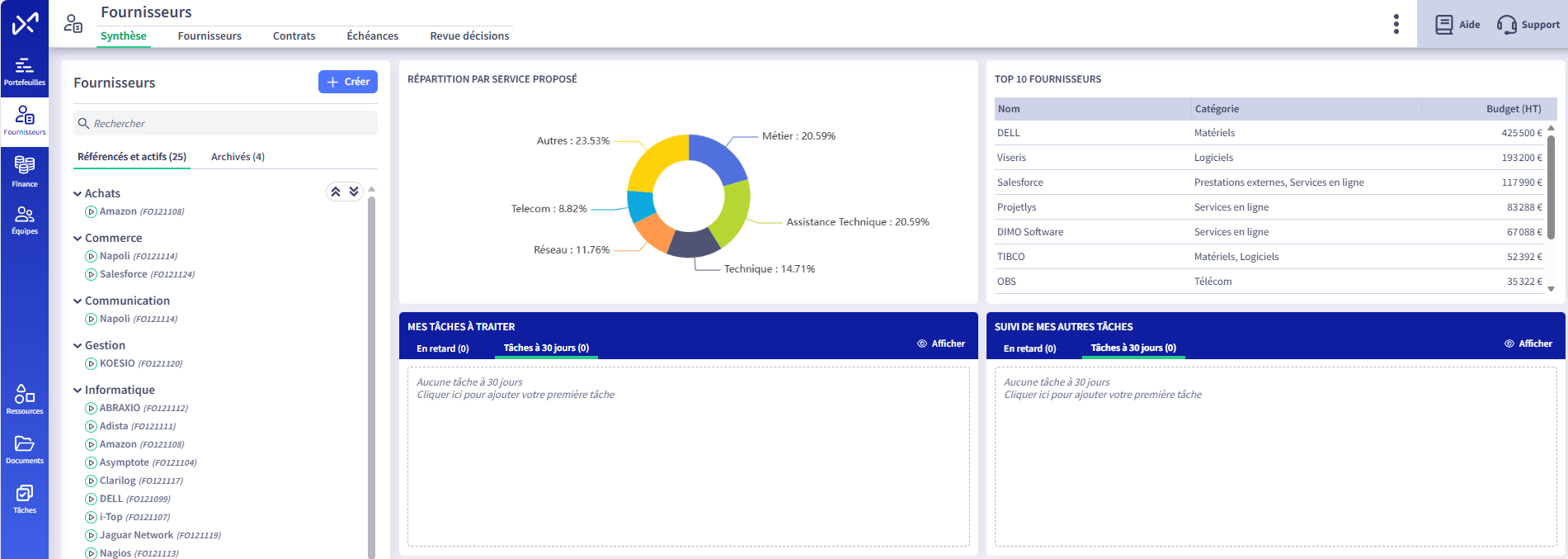 - Le Top 10 des fournisseurs : consolidation des 10 fournisseurs ayant les budgets les plus élevés sur l'exercice actif