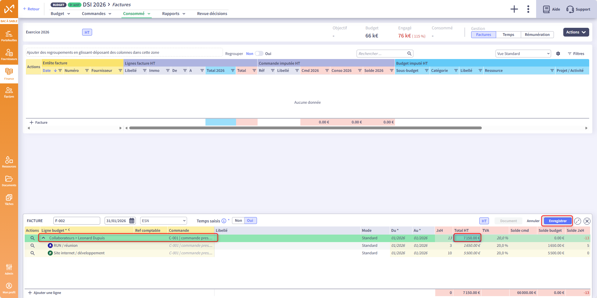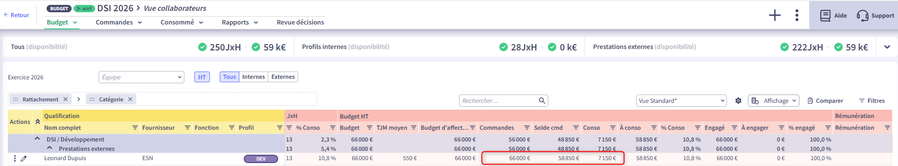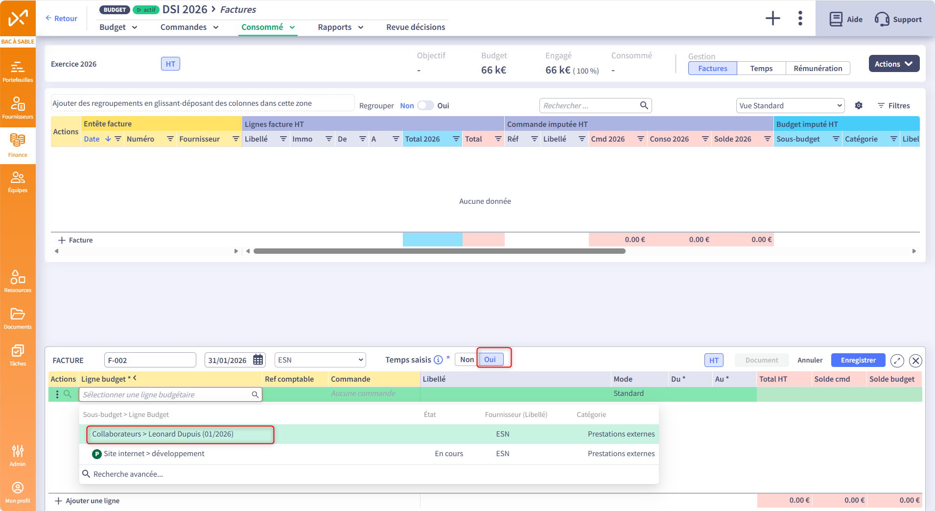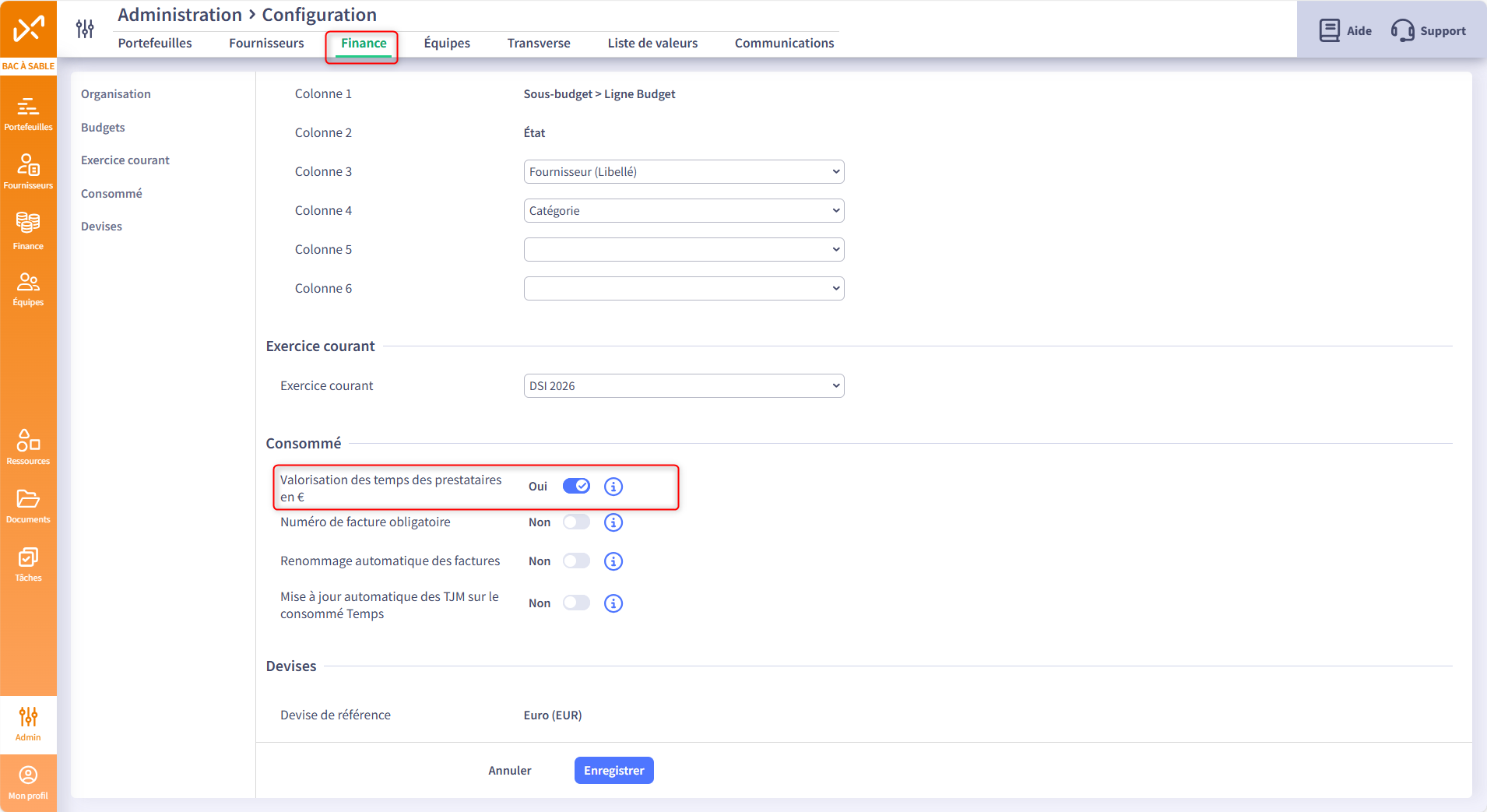 Lorsque cette option est activée, les temps passés par le prestataires sont automatiquement valorisés en € sur les lignes budgétaires concernées.