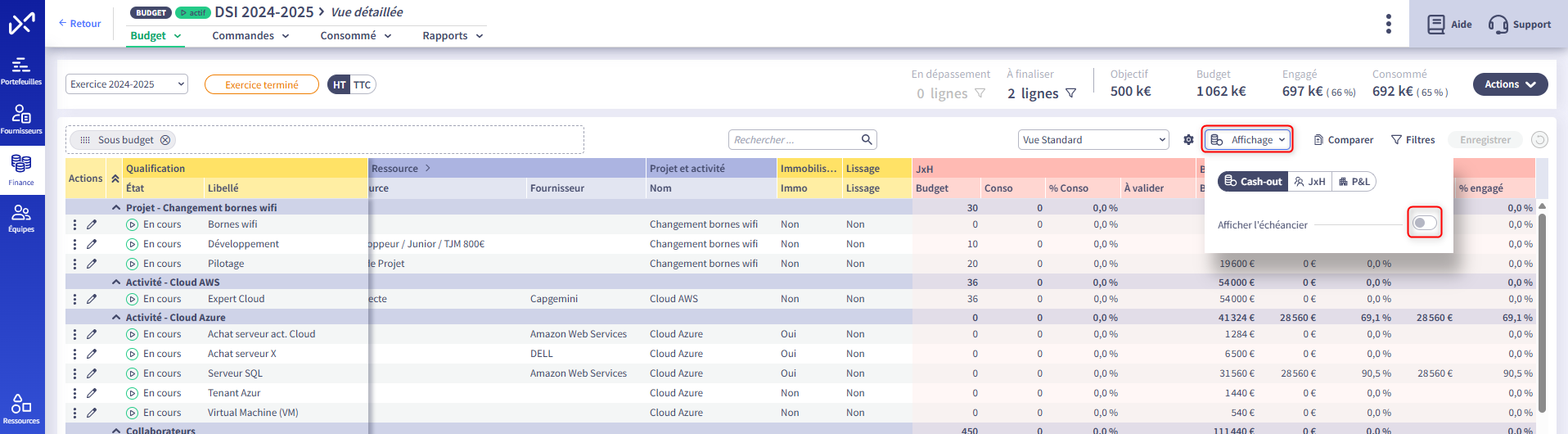 Une autre méthode qui peut être complémentaire à la précédente, est de réaligner votre budget par rapport à votre consommé. Pour cela, vous pouvez afficher la vue qui présente l'échéancier mensuel :